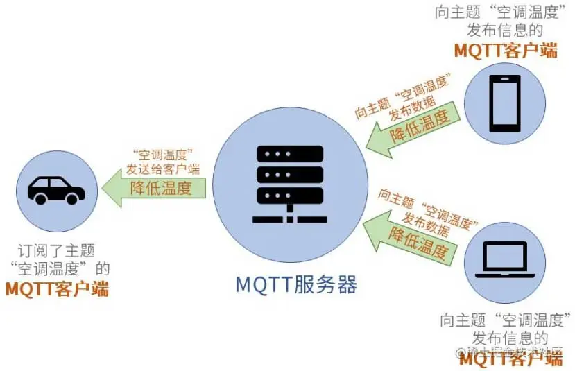 上图中的所有客户端都是围绕“空调温度”这一主题进行通讯的。对于“空调温度”这一主题,手机和电脑客户端成为了MQTT信息的发布者而汽车则成为了MQTT信息的订阅者(接收者)。