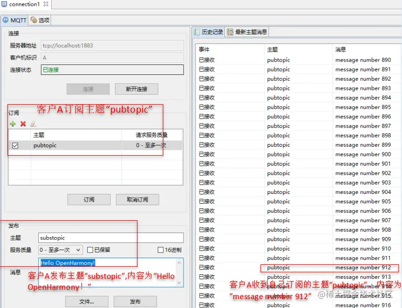 客户端A也做了两件事:1、订阅主题为pubtopic的信息;2、发布一条主题为substopic的信息,内容为“Hello OpenHarmony!”。