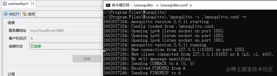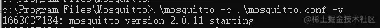 修改配置后,在安装目录打开命令窗口,输入.\mosquitto -c .\mosquitto.conf -v。服务器启动成功后,如下图显示mosquitto version 2.0.11 starting.