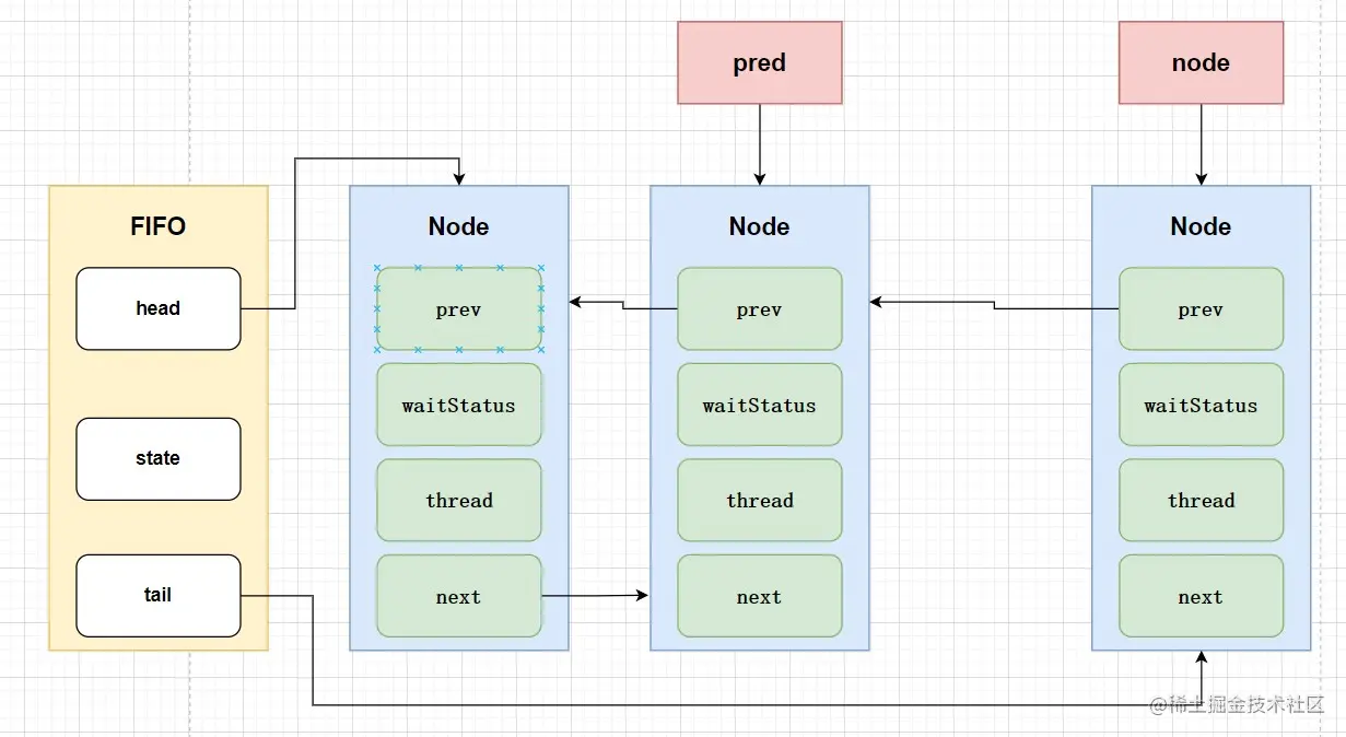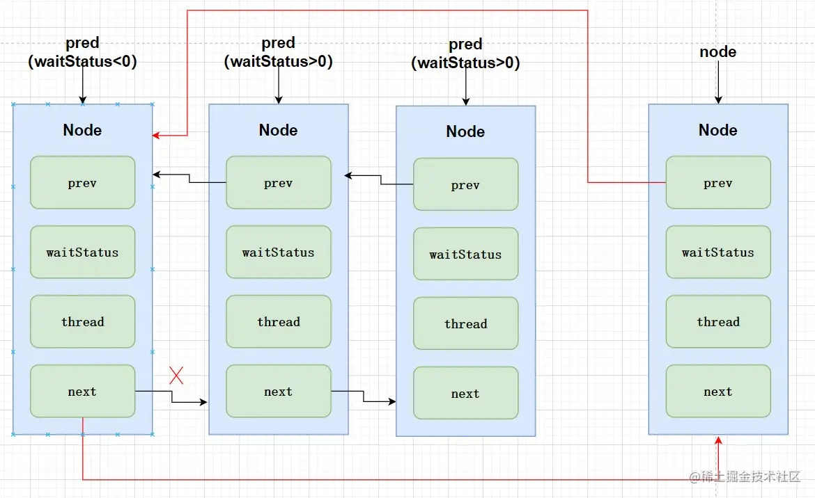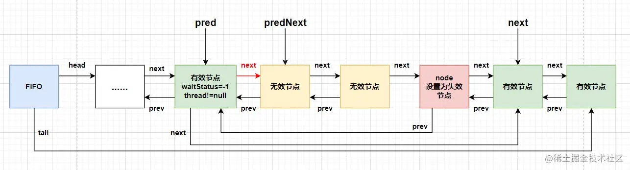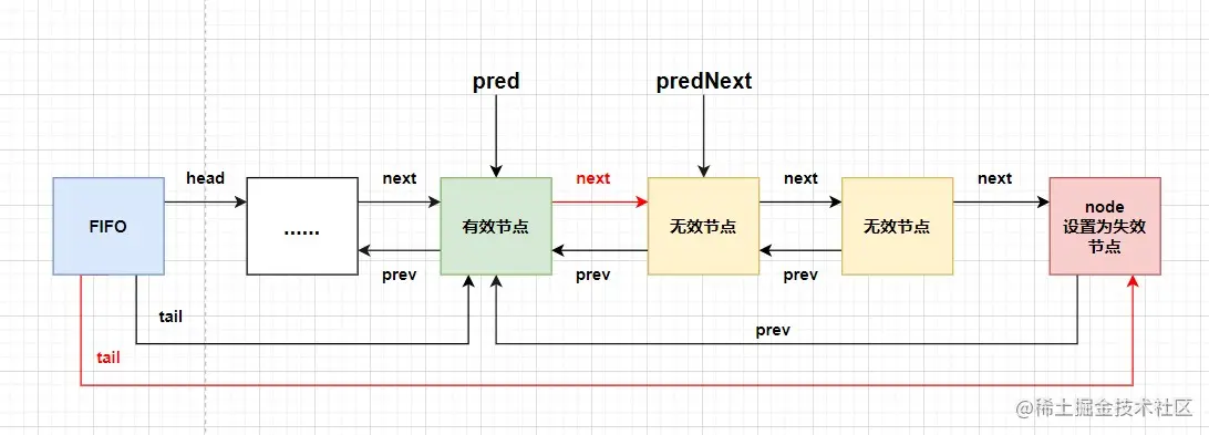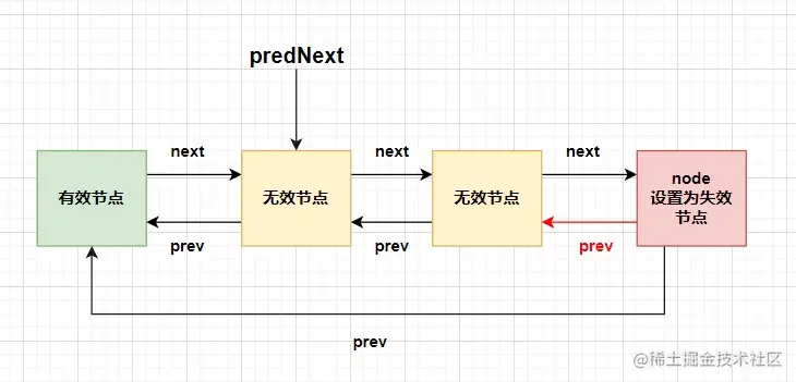 执行到while时找到前驱节点中最近的有效节点,把当前节点node挂到有效节点后边,可以过滤掉当前节点前的失效节点。声明出有效节点的第一个后继无效节点predNext,并把当前的node节点状态设置为失效状态。