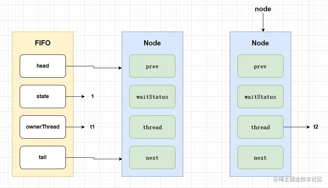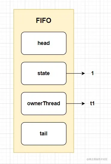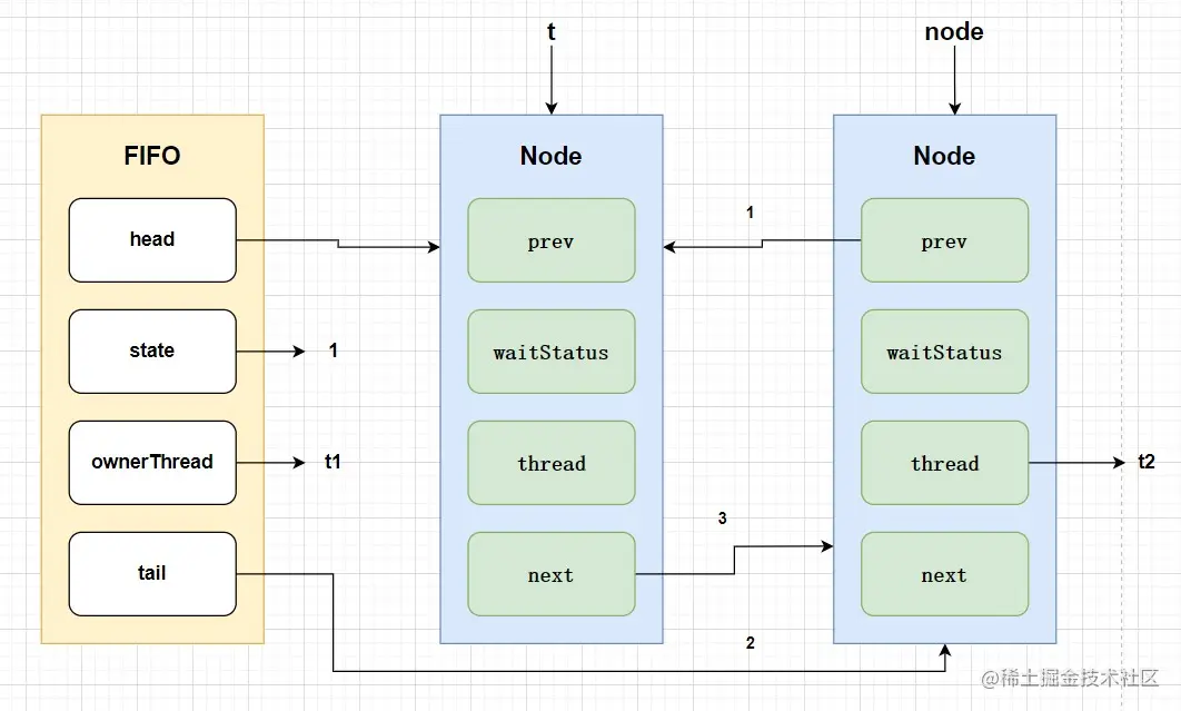 假设有两个线程(t1、t2)在竞争锁资源,线程1获取锁资源之后,执行setExclusiveOwnerThread操作,设置属性值为当前线程t1