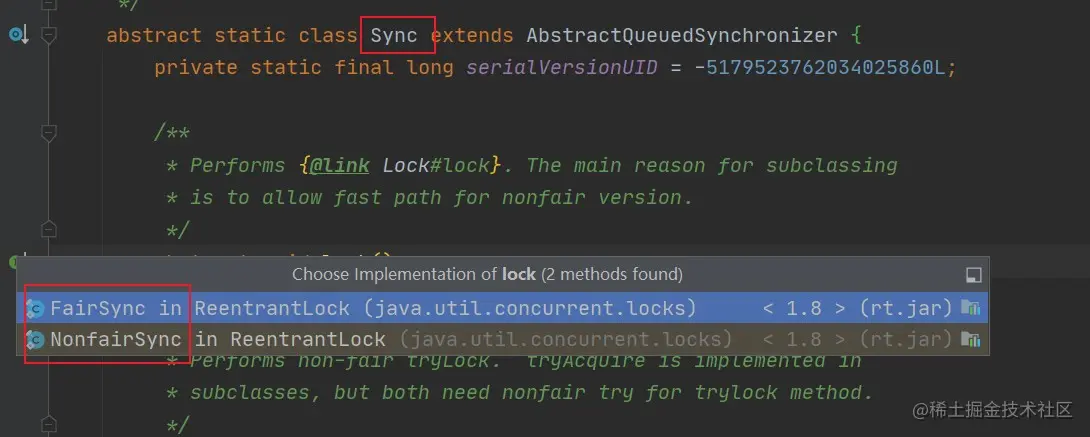 //AQS 是基类,具体实现在自己的类中实现,我们去查看“非公平锁”中的实现