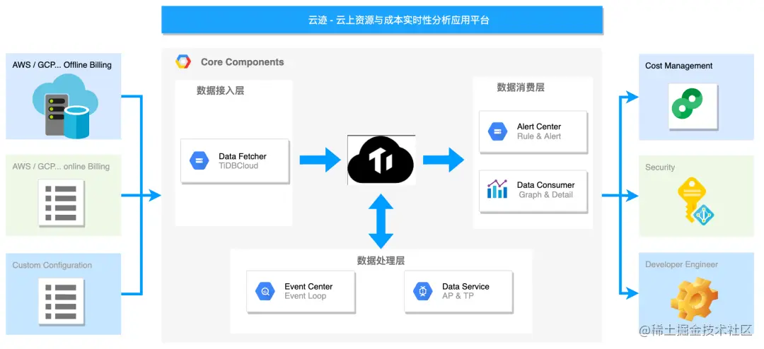 云迹这个项目正好解决了这个痛点,叶鋆郴认为,“云迹”项目体现出了三方面应用价值:第一,演示了企业在云上部署架构下统一成本分析、关键指标监控告警的问题;第二,考虑到云上账单和资源成本的数据量巨大,统计分析实时查询、告警要求多,项目采用了 TiDB 作为存储和计算引擎,发挥了 TiDB 在 HTAP 应用场景下的价值。比如遇到异常情况下,如果告警不及时,有可能就会带来很大的财产损失,TiDB 的 HTAP 能力正好满足了海量数据场景下的实时性要求;第三,本次 Hackathon 主办方为参赛者提供了一些 TiDB Cloud 和 AWS 的免费额度,在云上为团队搭建应用、部署、开发提供了更好的便捷性。