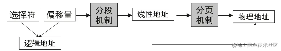 Linux中的内存控制单元(MMU)通过一种称为分段单元(segmentation unit)的硬件电路把一个逻辑地址转换成线性地址,接着,第二个称为分页单元(paging unit)的硬件电路把线性地址转换成一个物理地址。