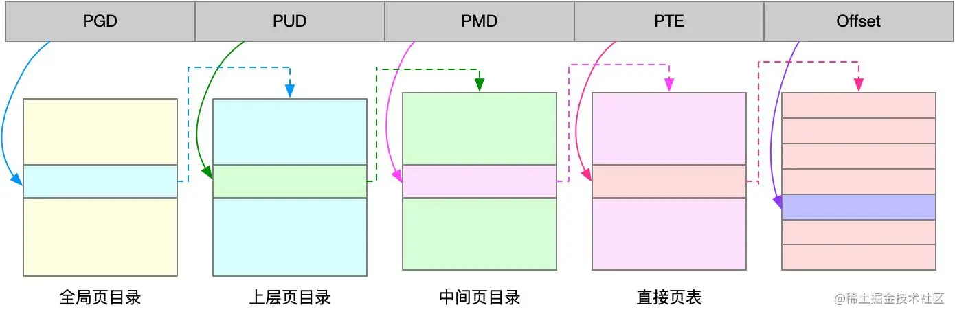 页全局目录包含若干页上级目录,页上级目录又依次包含若干页中间目录的地址,而页中间目录又包含若干页表的地址。每个页表项指向一个页框。线性地址被分成5部分。