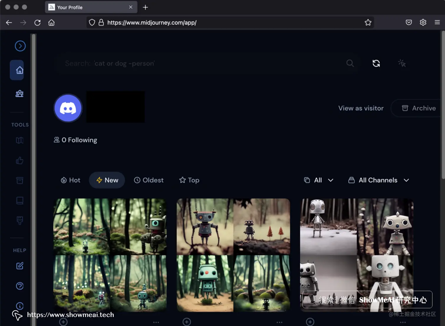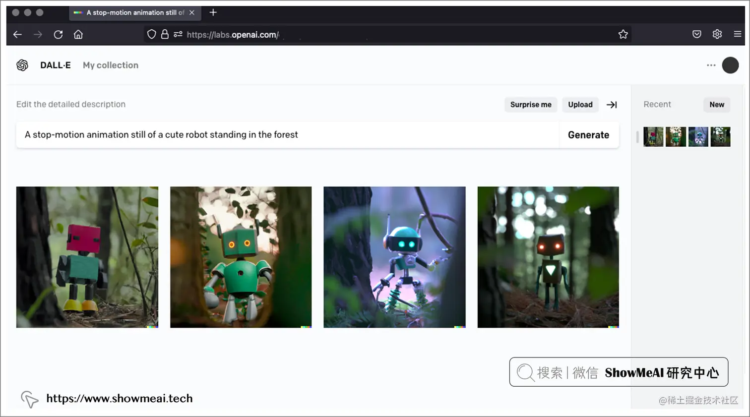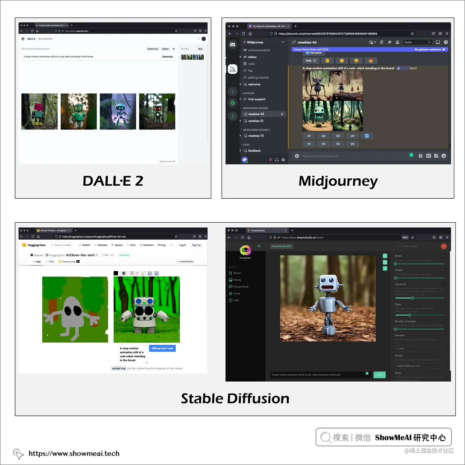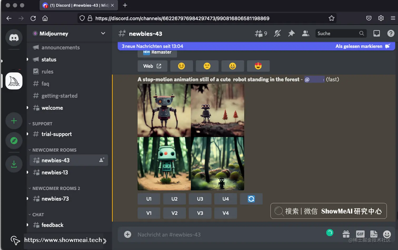 上面的截图,是在 Midjourney Discord Server 上提交提示 A stop-motion animation still of a cute robot standing in the forest (一个可爱的机器人站在森林里的定格动画) 的运行结果。