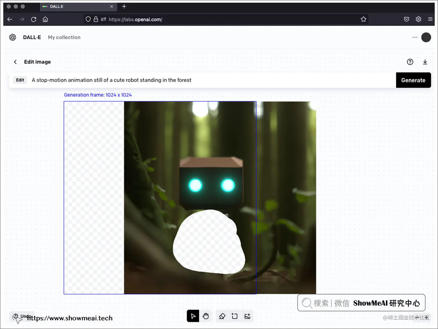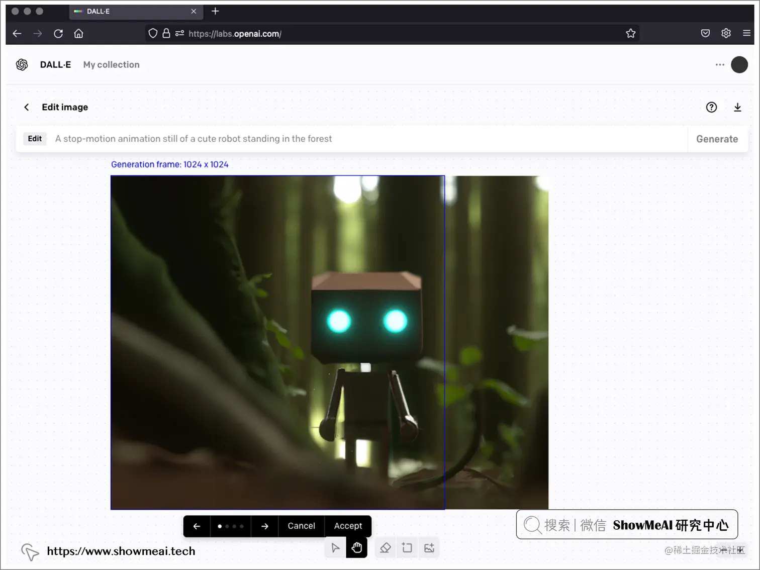 上图 DALL·E 作画提示词:A stop-motion animation still of a cute robot standing in the forest (一个可爱的机器人站在森林里的定格动画)。