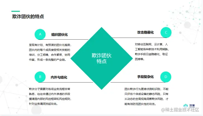 团伙欺诈往往具有组织团伙化、内外勾结化、攻击隐蔽化和手段复杂化的特点。