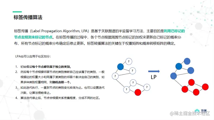 是基于关联图谱的半监督学习方式。主要目的是利用已标记的节点去预测为标记的节点的标签。在标签传播的过程中,各个节点根据周围节点标签的加权来更新自己标签的概率分布,当所有节点的概率分布趋于稳定之后停止更新。