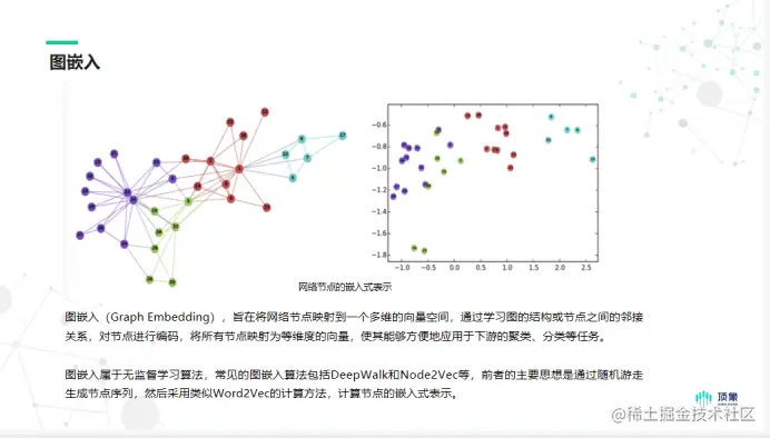 图嵌入属于无监督学习算法,常见的图嵌入算法包括DeepWalk和Node2Vec等,前者的主要思想是通过随机游走生成节点序列,然后采用类似Word2Vec的计算方法,计算节点的嵌入式表示;后者是对前者的优化。