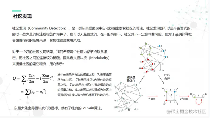 指的是一类从关联图谱中自动挖掘出群聚社区的算法。社区发现既可以是半监督式的,但更常见的是无监督式的。在一般情形下,聚集并不一定意味着风险;但对于金融这种社交属性很弱的场景来说,聚集往往意味着风险。