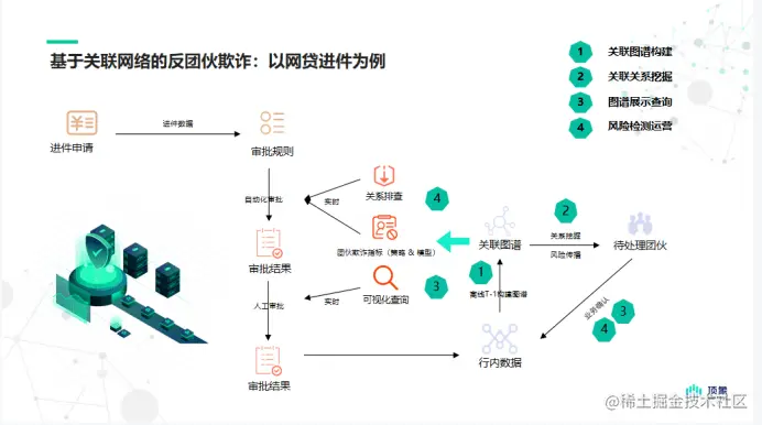 以网贷进件申请为例,我们重点关注关联网络技术是如何和实际的业务流程相结合的。从图中可以看到,当一个网贷进件申请进入行内的时候,会通过一系列的审批规则进行自动化审批。在这个过程中,通过关联图谱可以判断该申请人是否和已知的团伙有关联,如果有,则会提取出相关团伙的欺诈指标。通过策略和模型的形式预测风险,对那些风险比较高的申请会进一步进入到人工审批环节。在人工审批的环节,审批人员能够实时查询关联图谱,以可视化、交互式的方式去排查风险,最终通过或者拒绝。