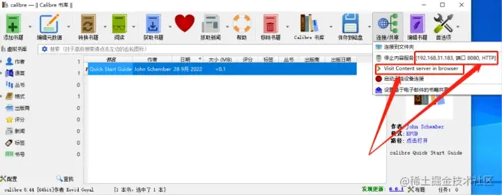 在软件下载完成后,可以直接点击软件安装包进行安装。(Calibre在360软件管家中也提供下载)。软件安装完成后,可以先打开calibre进行电子书的网络设置,即点击软件上方服务栏的“连接/共享”,并在下拉菜单中点击“启动内容服务器”