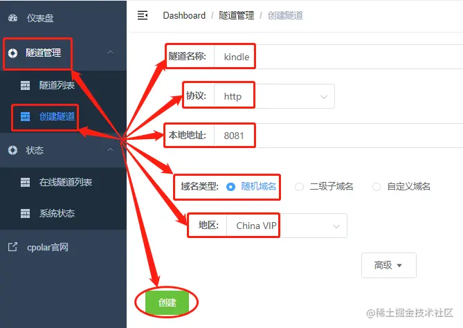 点击“启动内容服务”后,就能从信息显示中获得关键的端口信息(默认为8080端口)。接着打开cpolar客户端软件并登录,在cpolar主界面左侧找到并点击“隧道管理”项下的“创建隧道”,打开内网穿透数据隧道的设置页面。在这个页面内,我们需要对“隧道名称(与其他隧道区分的水命)”、“协议(http或https协议)”、“本地地址(即端口信息显示的8080端口)”、“域名类型(若在cpolar云端设置了保留数据隧道,则可根据保留的隧道类型选择)”和“地区(根据实际使用地选择即可)”进行设置。在各项设置都完成后,就可以点击页面下方的“创建”按钮,生成一条能从公共互联网访问到本地calibre书库的数据隧道。公共互联网所需的访问地址可在“状态”项下的“在线隧道列表”中找到。