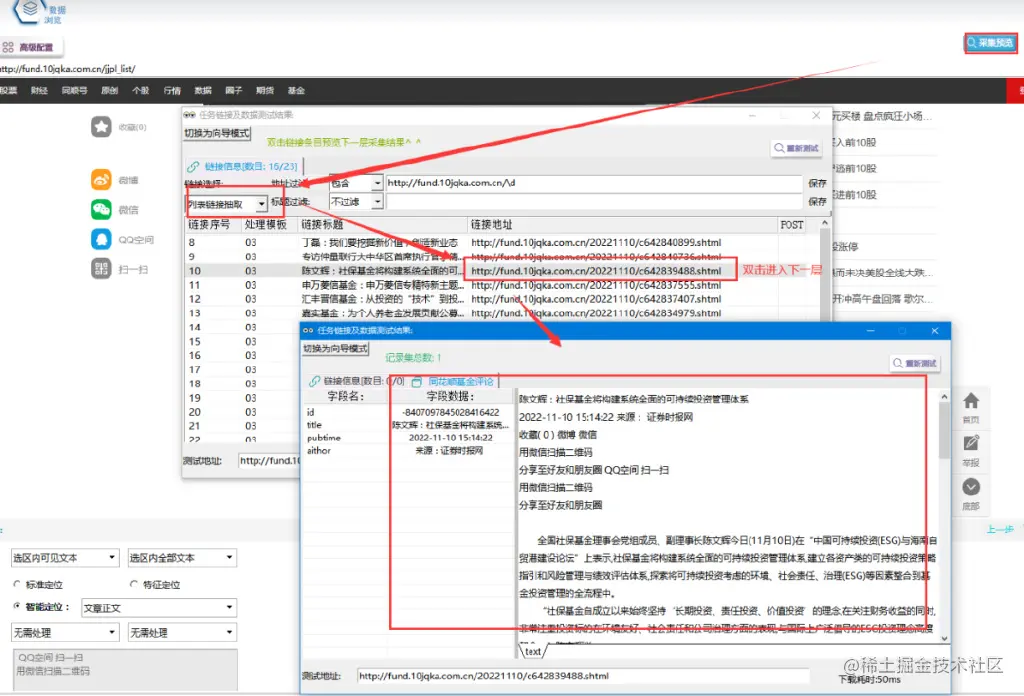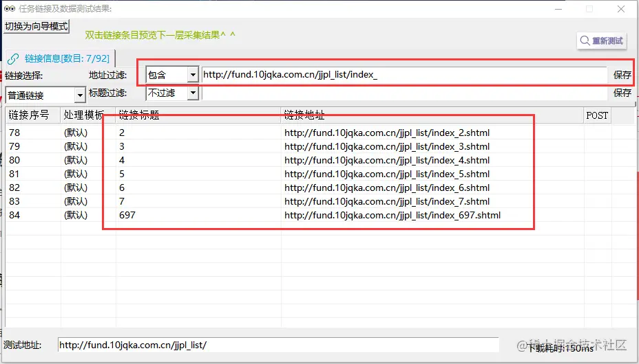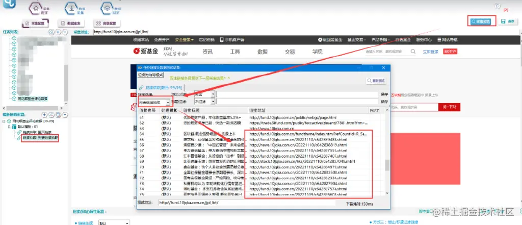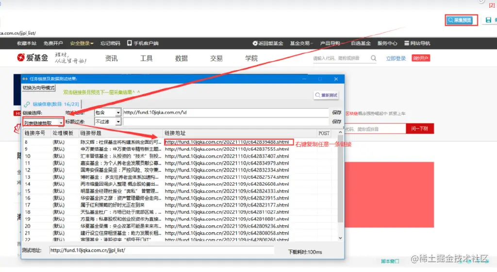②使用链接过滤的方法来获取列表链接,先采集预览,打开列表链接预览结果,找到帖子链接并观察规律,发现其中都包括:“fund.10jqka.com.cn/”+一串数字