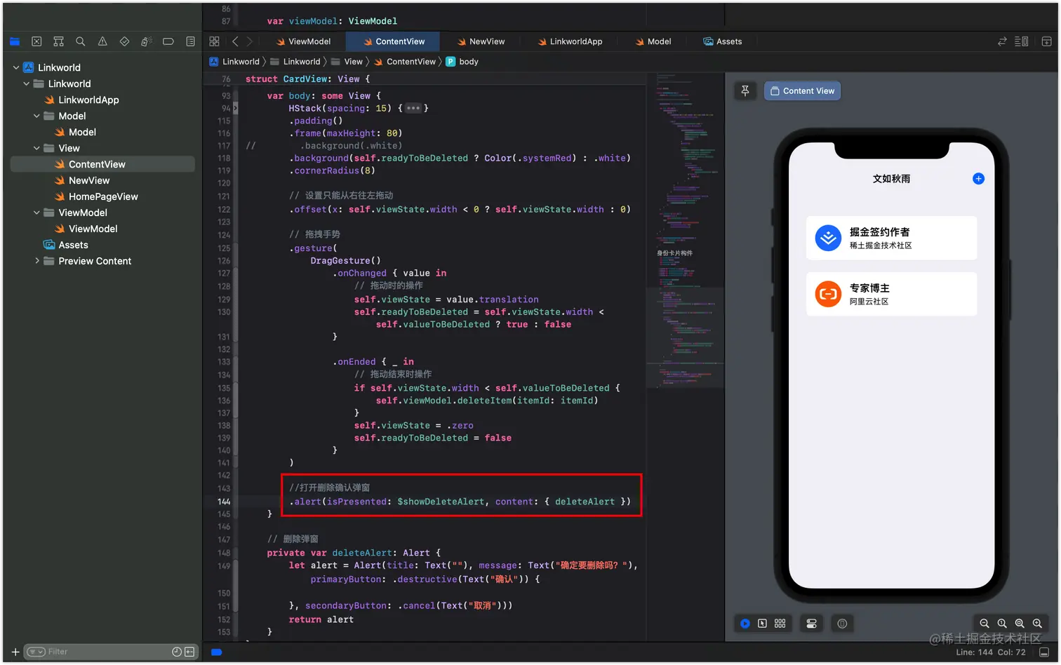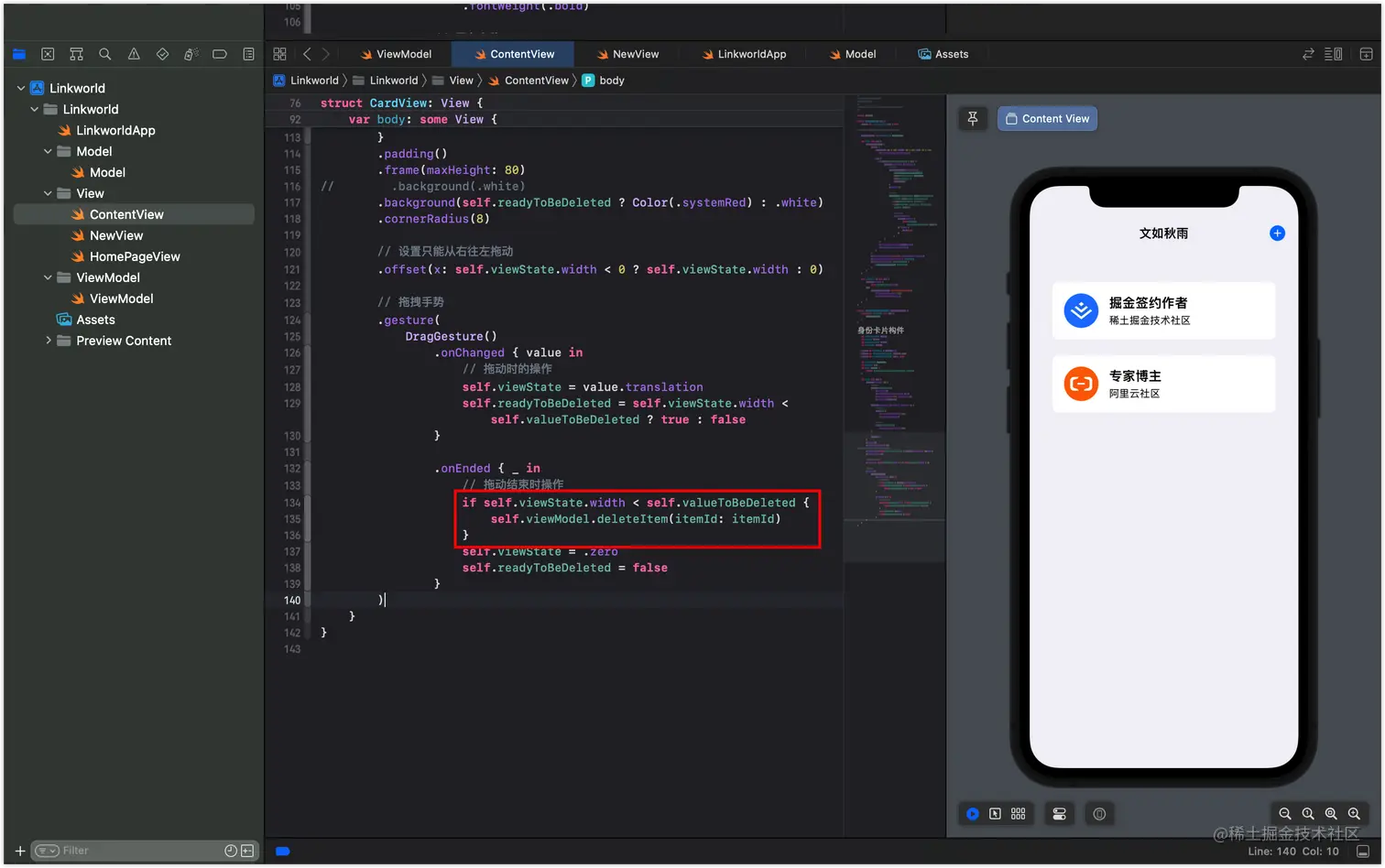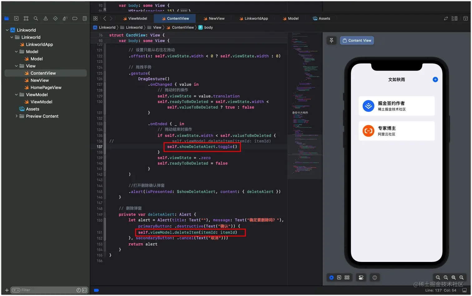 样式完成后,我们来实现删除逻辑,我们在ViewModel视图模型中创建了删除方法deleteItem,deleteItem方法需要基于卡片ID进行指定删除,而在CardView卡片构件中,并没有ID,而数据集和其ID是在ContentView视图中存在。