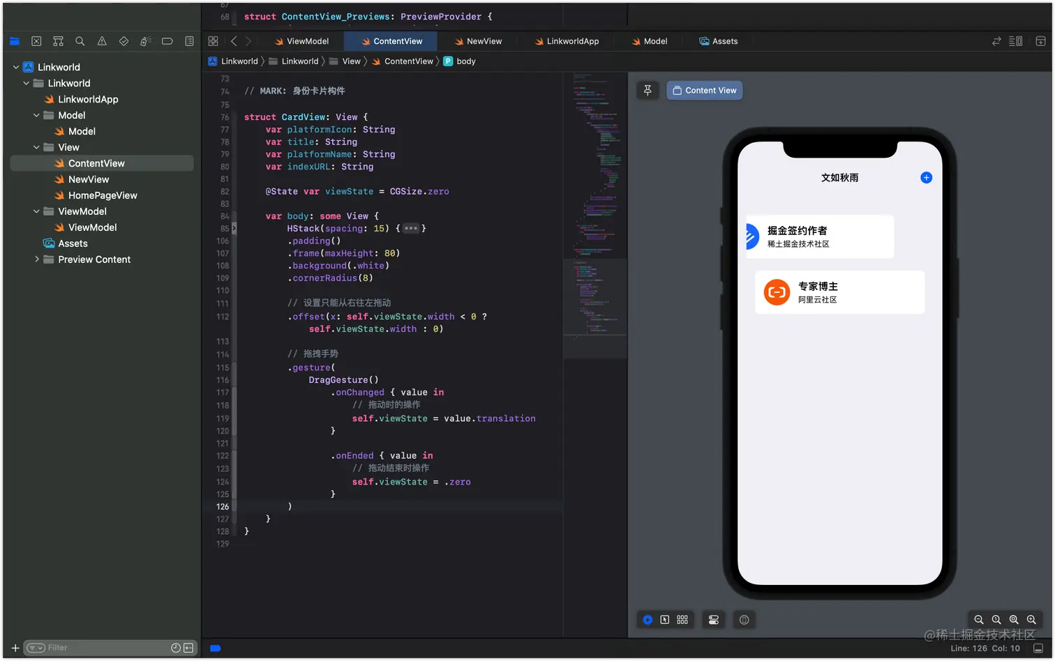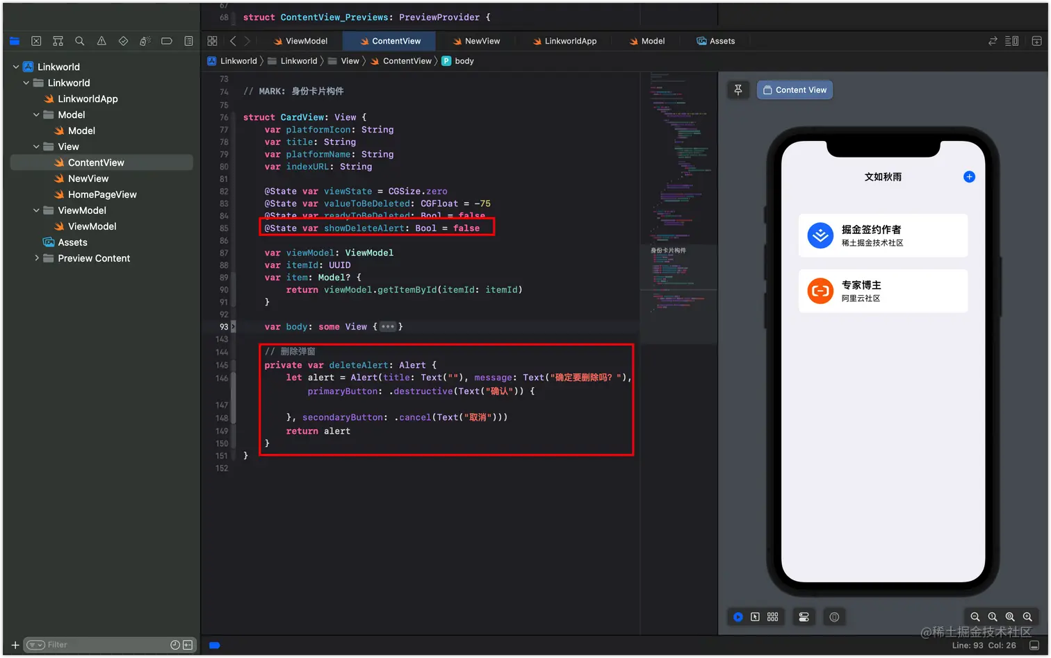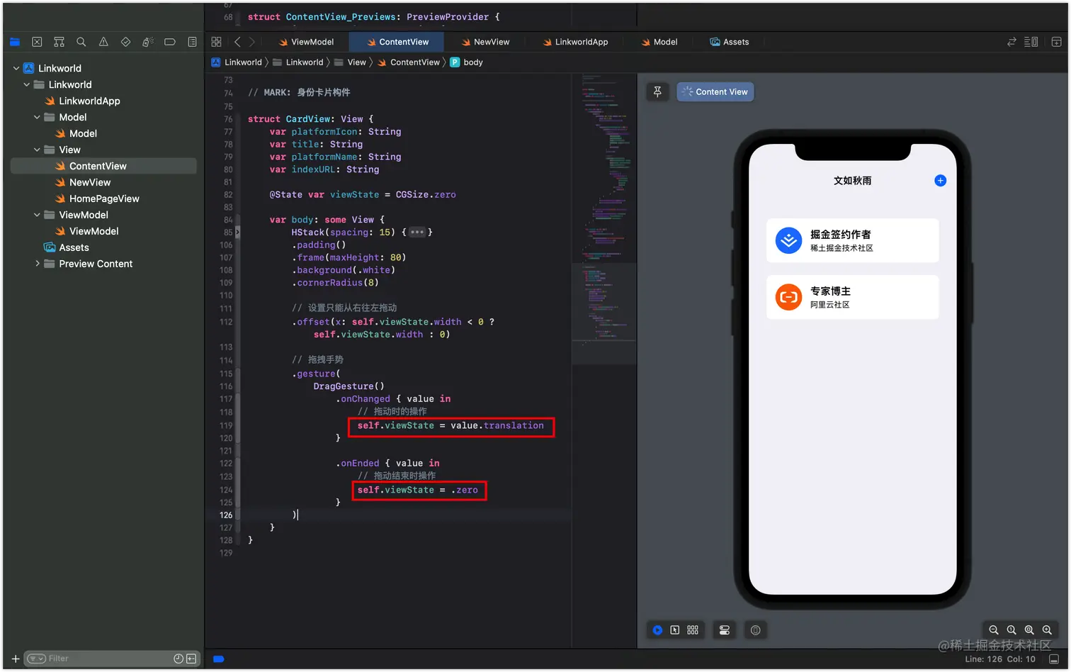 样式完成后,我们来实现删除逻辑,我们在ViewModel视图模型中创建了删除方法deleteItem,deleteItem方法需要基于卡片ID进行指定删除,而在CardView卡片构件中,并没有ID,而数据集和其ID是在ContentView视图中存在。