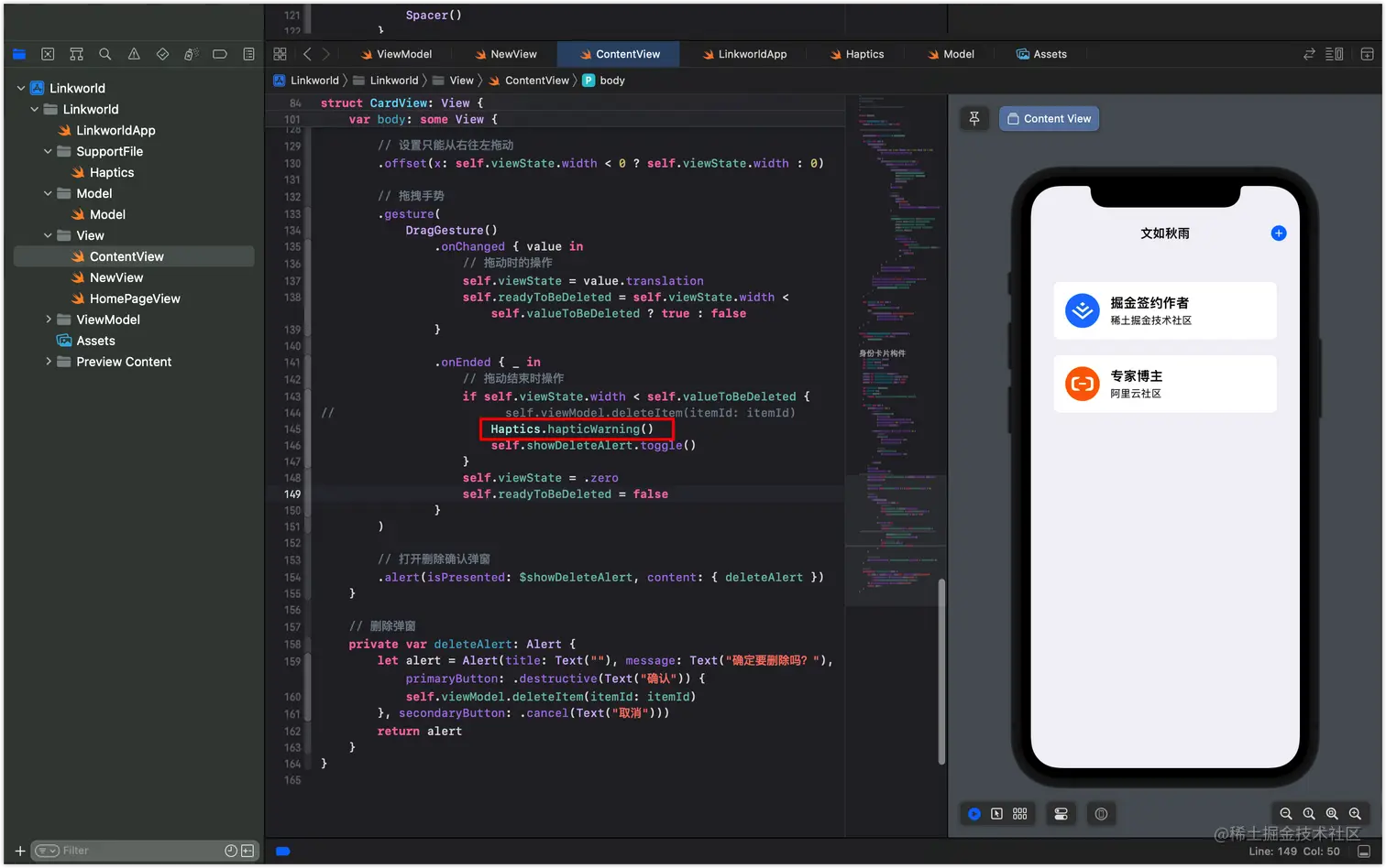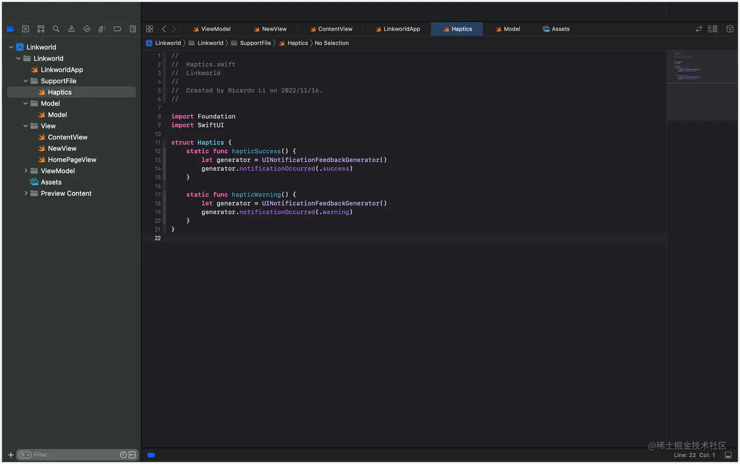 除了文字外,我们还可以再触发删除操作的时候添加震动反馈,进一步提升用户体验。 SwiftUI提供了反馈生成器 UIFeedbackGenerator供开发者调用iOS系统的线性马达形成震动效果。我们可以创建一个新的Swift文件专门管理震动反馈内容。
