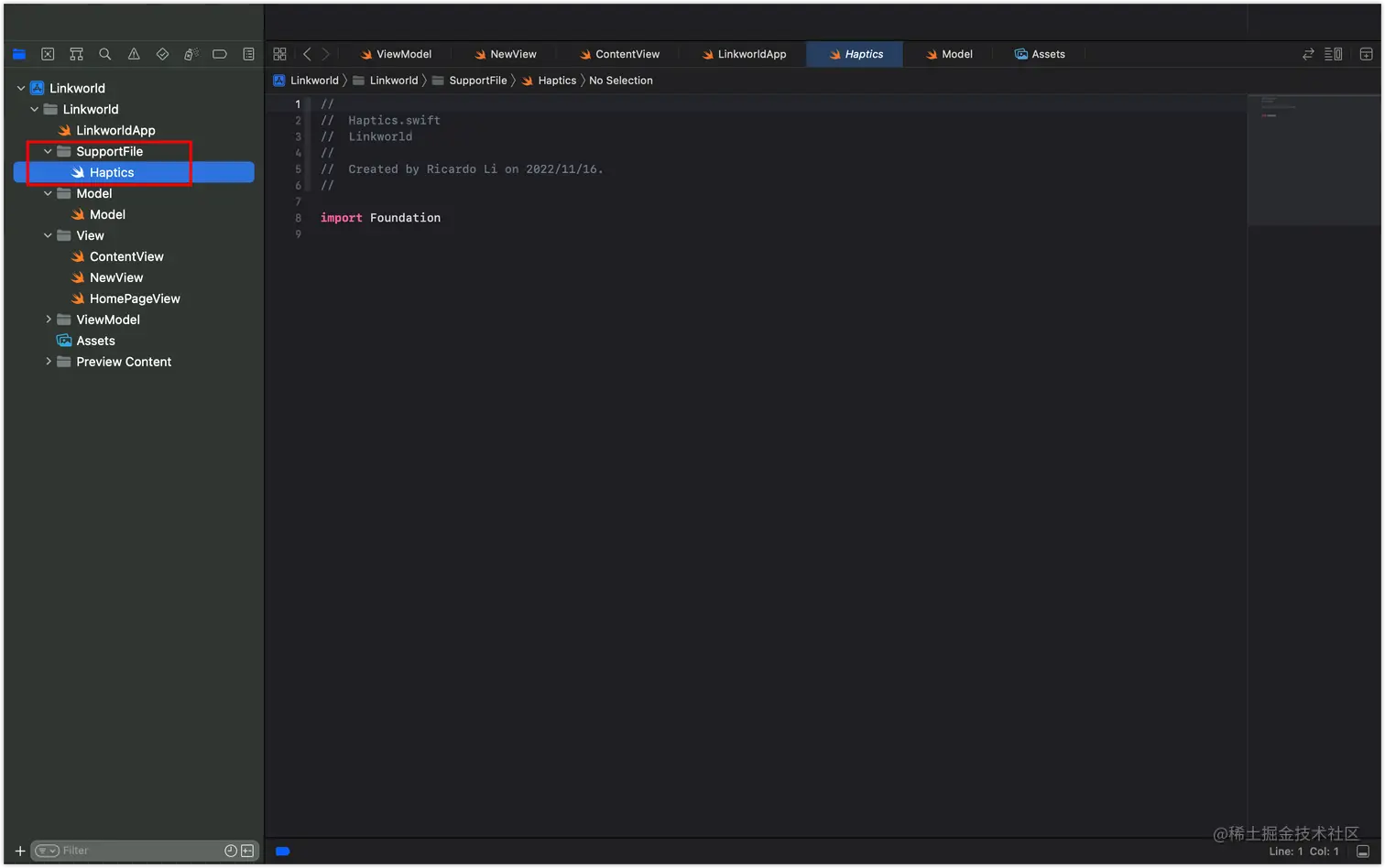 创建一个新的文件夹,命名为SupportFile,并创建一个新的Swift文件,命名为Haptics,如下图所示:
