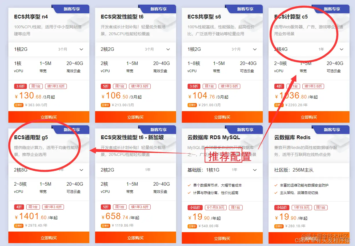 从阿里云展示的热销机型中,共享型N4,共享型S6和突发型T6为是初级配置,CPU有限制,但是价格很香,有一定访问量,对配置有要求的不要选择,计算型C5,通用型G5是最好的选择,性能不错,价格也能接受,建议选择,