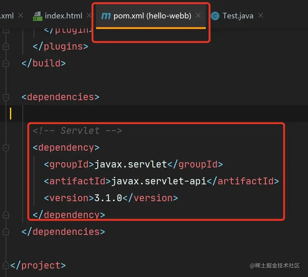 在pom.xml文件中添加servlet依赖