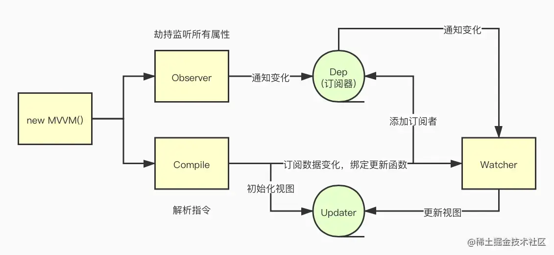 具体就是:MVVM作为绑定的入口,整合Observe,Compil和Watcher三者,通过Observe来监听model的变化,通过Compil来解析编译模版指令,最终利用Watcher搭起Observe和Compil之前的通信桥梁,从而达到数据变化 => 更新视图,视图交互变化(input) => 数据model变更的双向绑定效果。