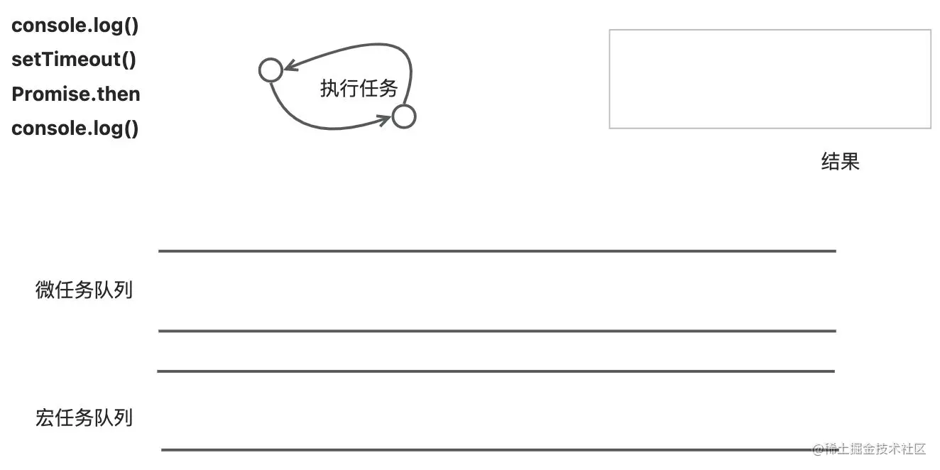 - 先执行第一个宏任务, 然后同步任务, 然后微任务, 然后下一个宏任务如此循环, 直到所有代码执行完毕