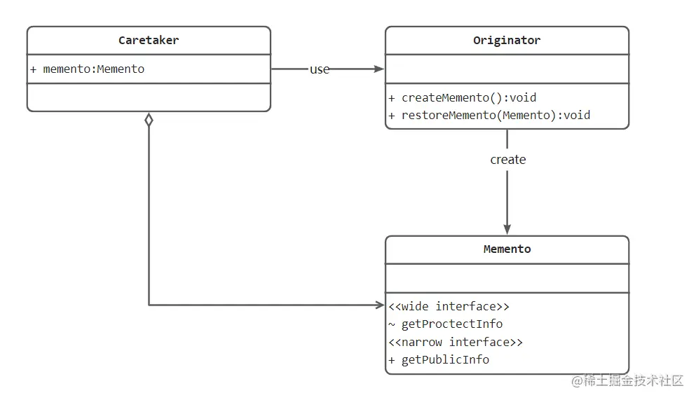 宽接口:用于获取恢复对象状态信息的方法集合,会暴露 Memento 对象里面所有信息,使用宽接口的仅限于 Originator 角色