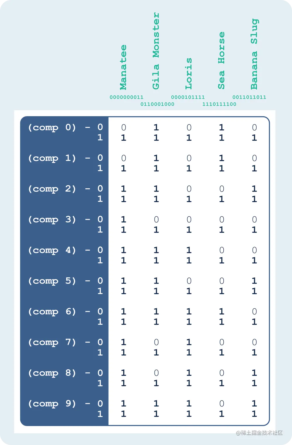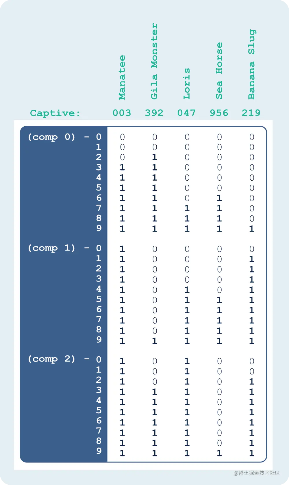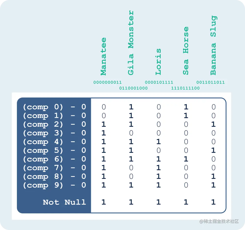 The first column of bits represents the base-2 value 000000011, which is the number of Manatees in captivity (3 in base-10). Since component 0 and component 1 of 000000011 are both 1, we set a bit in component 0, row 1 and component 1, row 1. Since the remaining components of 000000011 are all 0, we set a bit in row 0 for components 2 through 9, and also—because these are range-encoded—we set a bit in every value greater than 0. In the case of base-2 components, that means we also set the bit in row 1 for components 2 through 9.