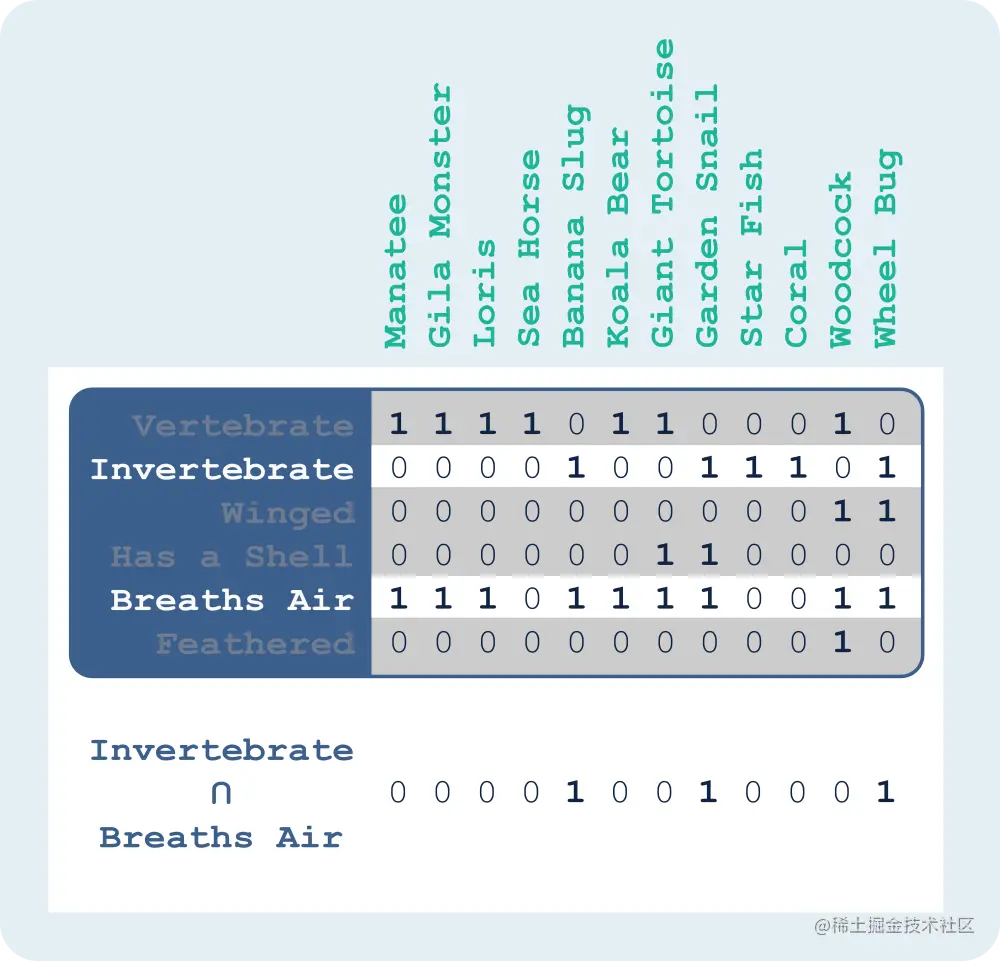 The example above shows a set of equality-encoded bitmaps, where each row—each trait—is a bitmap indicating which animals have that trait. Although it’s a fairly simple concept, equality-encoding can be pretty powerful. Because it lets us represent everything as a boolean relationship (i.e. a manatee has wings: yes/no), we can perform all sorts of bitwise operations on the data.