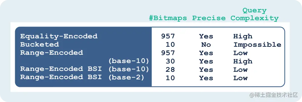 The examples that I described in this post showed how we can use Bit-sliced indexes to significantly reduce the number of bitmaps we need to represent a range of integer values. And by applying range-encoding to our indexes, we are able to perform various range queries on our data. The chart below compares the different approaches that we discussed.