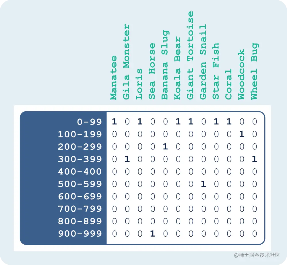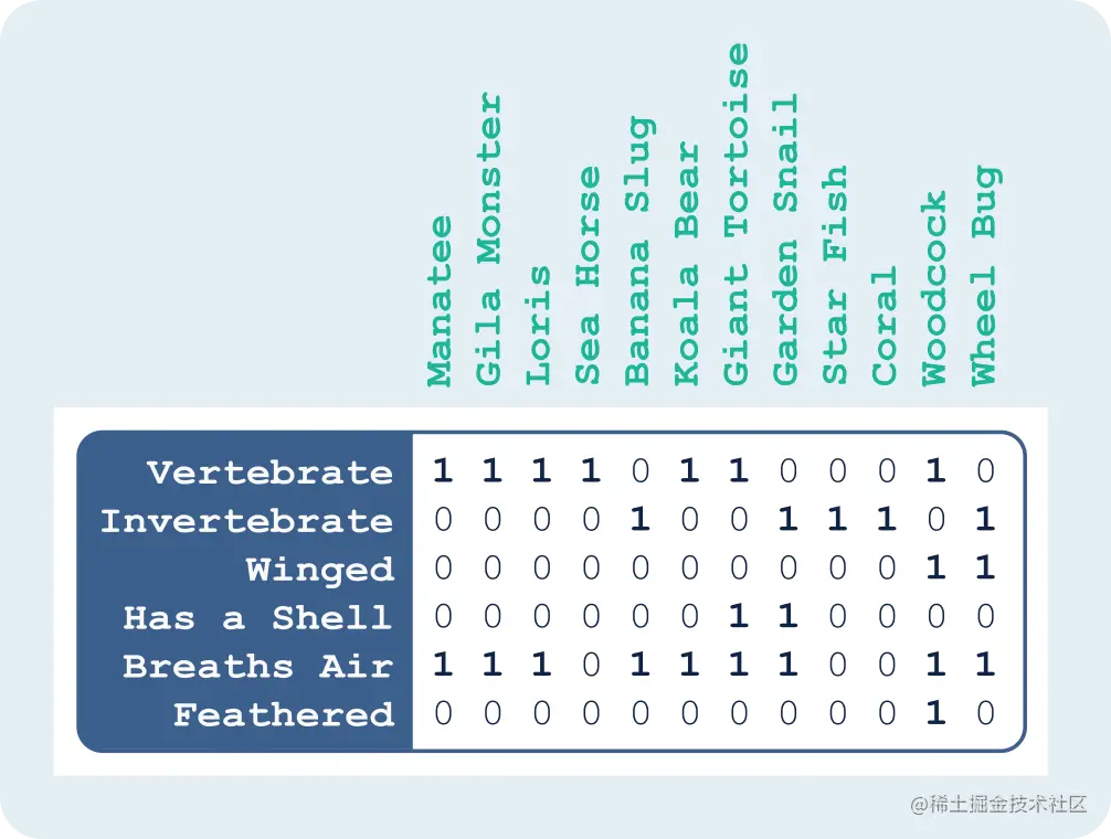 To get started, let’s assume that we want to catalog every member of the Animal Kingdom in such a way that we can easily, and efficiently, explore various species based on their traits. Because we’re talking about bitmaps, an example data set might look like this: