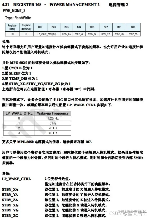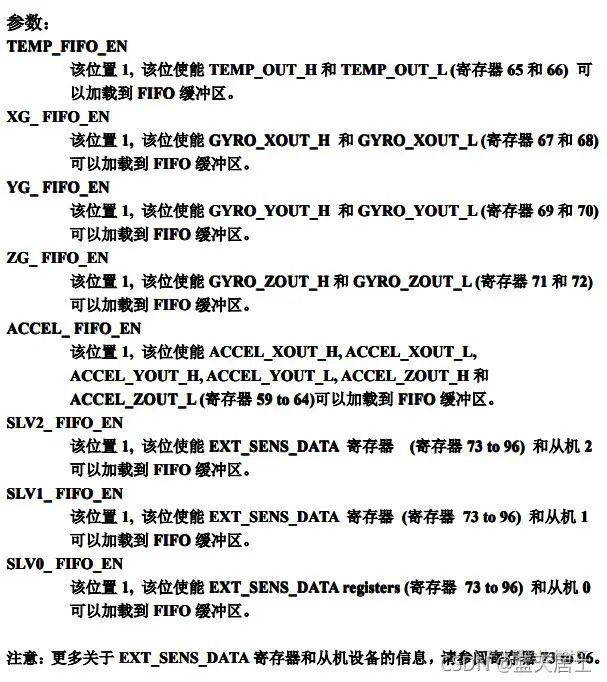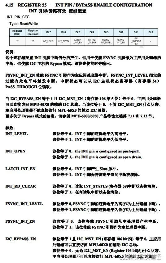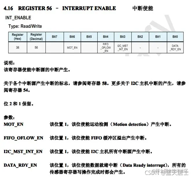 INT_ENABLE(0x38)这个寄存器上边已经介绍过了,此处写0代表不使能MOT_EN、FIFO_OFLOW_EN、I2C_MST_INT_EN、DATA_RDY_EN。