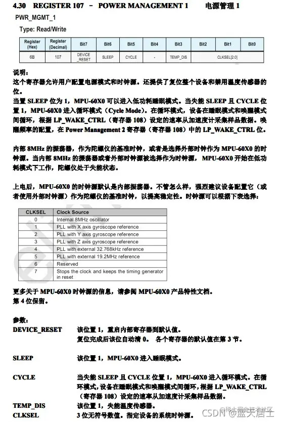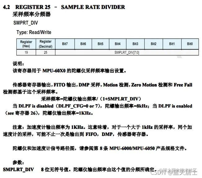 如果使用了DMP功能,则需要多设置一个BIT_DMP_RST(0x08)。同样参考上边的USER_CTRL(0x6A)寄存器说明,Bit3并没有意义,因此这里应该是手册中的寄存器说明不够详细,实际上是有意义的。