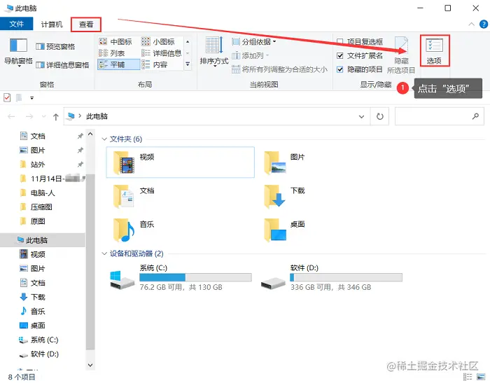 步骤1:打开电脑桌面的【此电脑】,找到【查看】选项里面的【选项】,并点击;