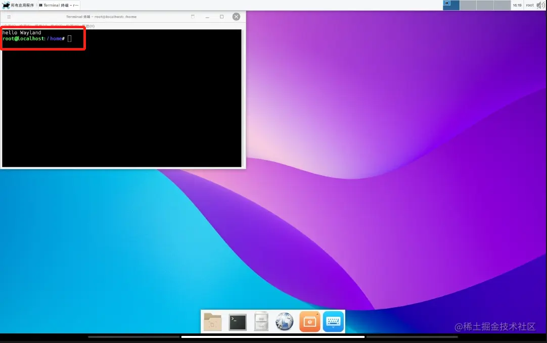 上面的方式我将其写在判断语句里面,这样有什么不同呢,会直接进入全屏的Wayland,并且在shell界面,并且你可以将echo的输出的代码更换成你要启动的qt界面程序,或者其他需要再Wayland启动后的某个程序