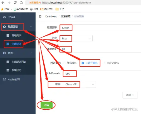 在这个页面,我们同样需要进行几项设置。包括:“隧道名称”可以看做该隧道的说明,用于与其他本地隧道区别开;“协议”我们选择http;“本地地址”需要与phpstudy设定的端口号一致;“域名类型”我们勾选“二级子域名”,勾选二级子域名后会在下一行出现“Sub Domain”栏位,这里需要输入在cpolar云端保存的二级子域名;最后的“地区”选择实际使用地区即可。完成这些设置后,就可以点击页面下方的“创建”按钮,将cpolar云端的数据隧道与本地Discuz网页关联起来。