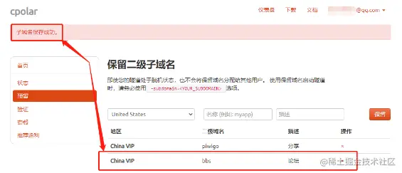 首先我们需要登录cpolar官网,在“仪表盘”页面左侧找到“预留”按钮,点击进入预留页面。在这个页面中,我们找到“保留二级子域名”栏位,进行几项简单的设置,保留一个专属的二级子域名(即创建一条空白数据隧道,为我们之后的内网穿透工作做好准备,同时保留二级子域名为VIP内容,需要对cpolar升级至基础版及以上才能使用)。这几项设置分别为“地区”(我们选择实际使用地即可)、“二级域名”(该内容会显示在最终的网络地址上,因此需要输入合适内容)、“描述”(可以看做这条数据隧道的备注,方便我们进行识别)。