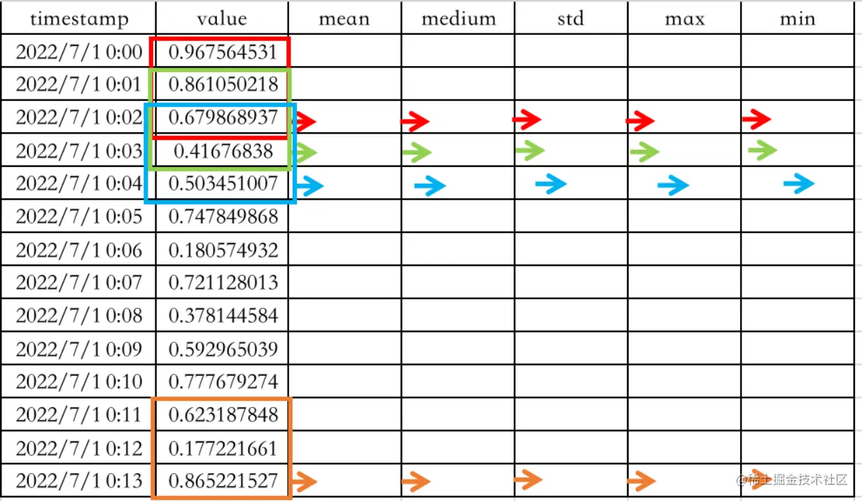 滑动窗口统计: 时间序列的一个重要特性就是当前或未来预测值与历史值是息息相关的,通过滑动窗口构造窗口统计量则可以解决数值之前这种强相互关系的问题。