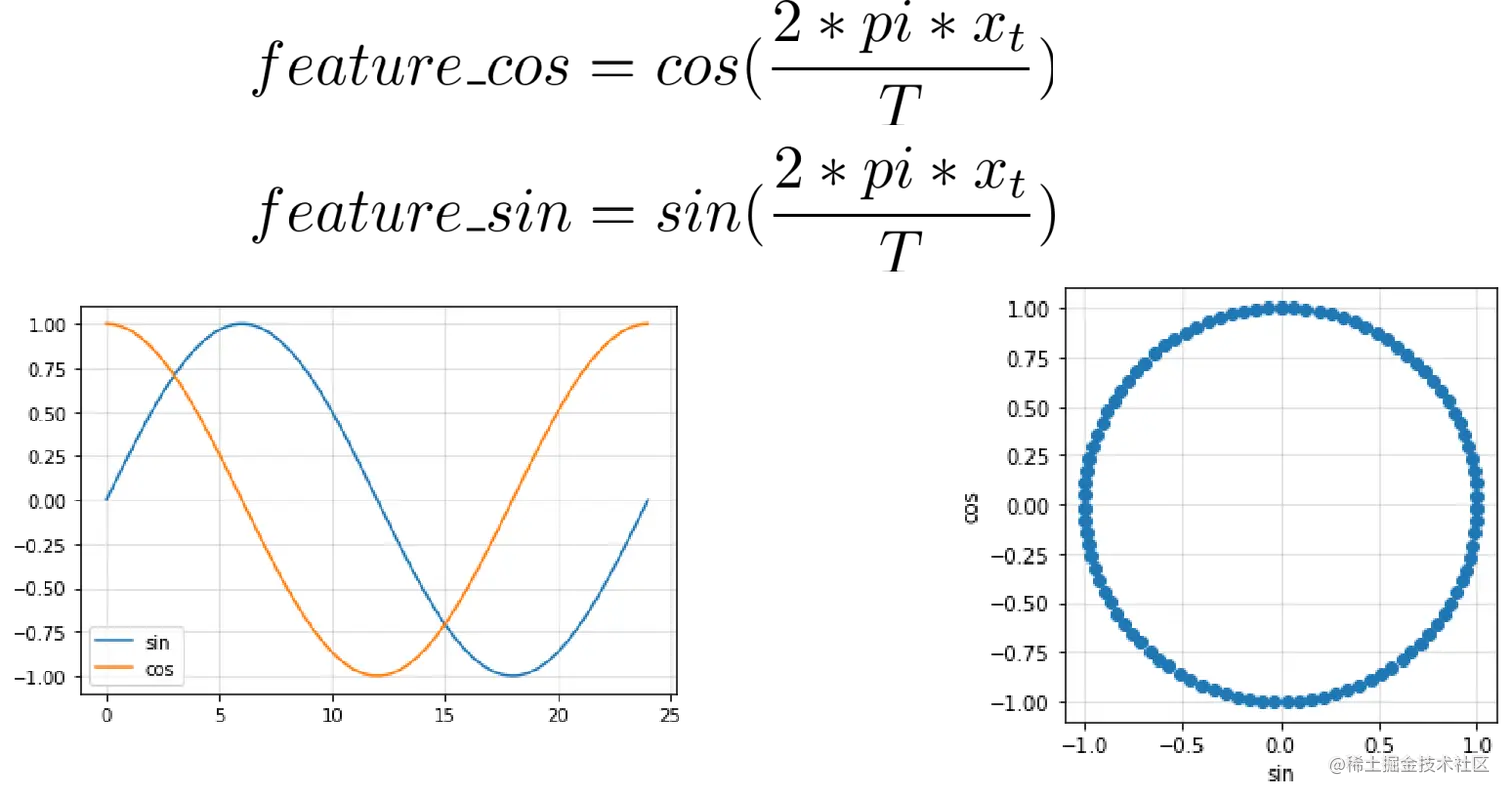 时间序列是有周期性的,比如一天、一周或是一年。由于 sin 与 cos 函数均只能体现半周期性,故时间序列的周期性需通过构造 sin 与 cos 函数作为两列特征来提前全周期性。
