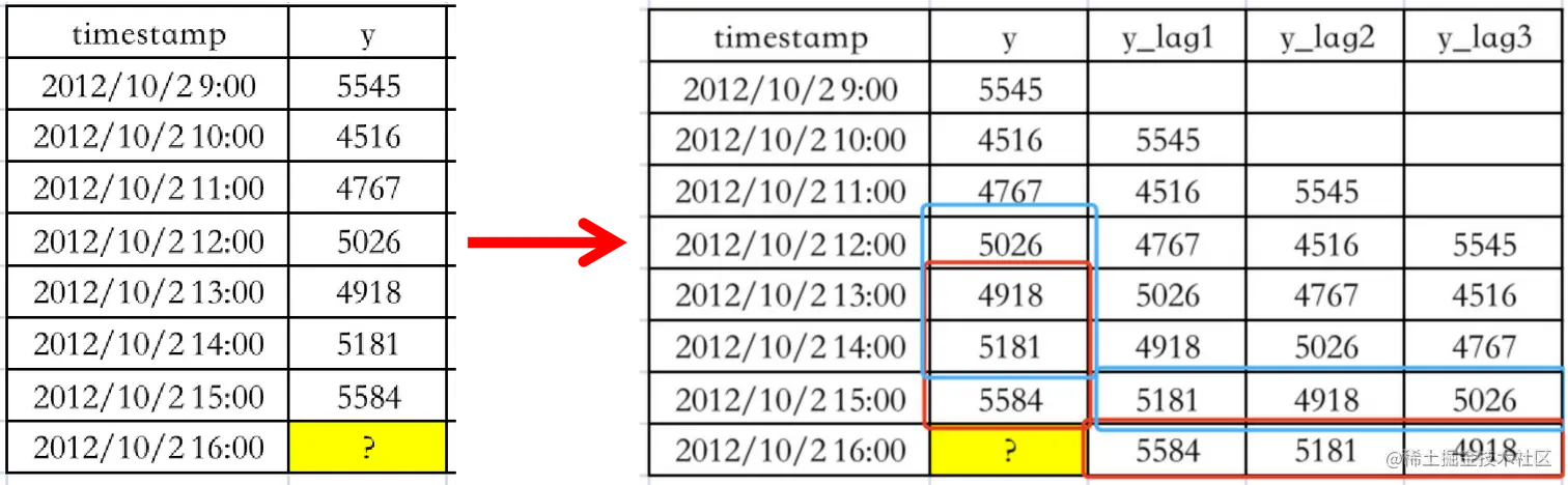 滞后特征: 滞后特征是一种特殊的滑动窗口。如下图所示,若需预测2012/10/2/ 15:00 的值 [5584],假设时间窗口长度为3,则可以使用 [5026,4918,5181] 进行预测。如果将 y 向下移动一个时间窗口,构造多个时间特征,则可以看出下图竖列的蓝色框可以变成横向的蓝色框,此时如需预测下图黄色框问号处的值,必定采用的是 [4918,5181,5584]。