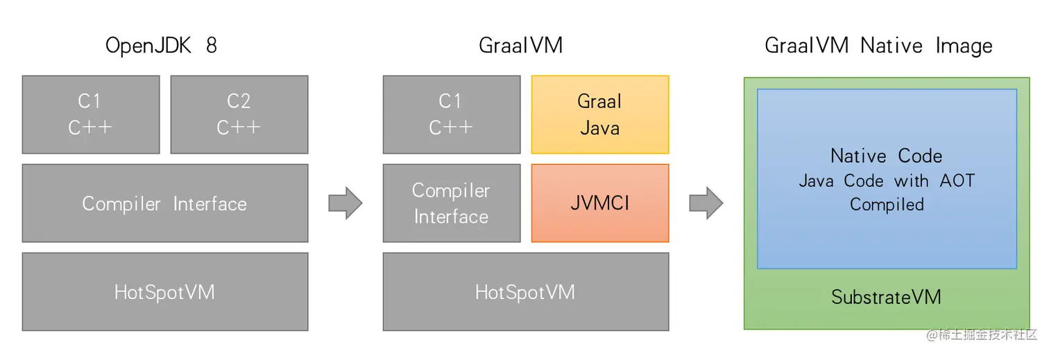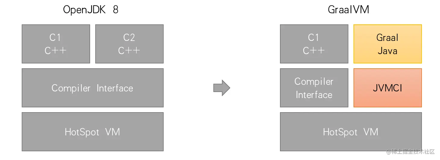Graal Compiler是GraalVM与HotSpotVM(从JDK10起)共同拥有的服务端即时编译器,是C2编译器未来的替代者。为了让 Java 虚拟机与编译器解耦,ORACLE引入了Java-Level JVM Compiler Interface(JVMCI)Jep 243 :把编译器从虚拟机中抽离出来,并且可以通过接口与虚拟机交流(openjdk.java.net/jeps/243)