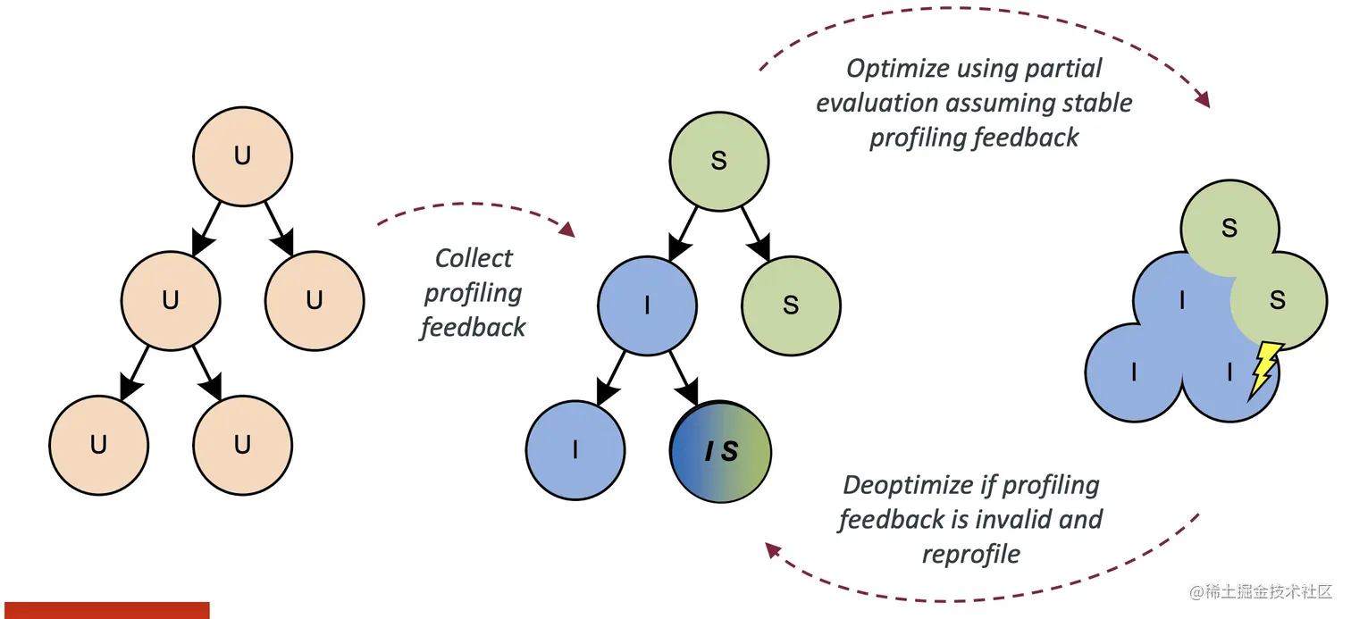 在即时编译过后,如果运行过程中发现 AST 节点的实际类型和所假设的类型不同,Truffle 会主动调用 Graal 编译器提供的去优化 API,返回至解释执行 AST 节点的状态,并且重新收集 AST 节点的类型信息。之后,Truffle 会再次利用 Graal 编译器进行新一轮的即时编译。