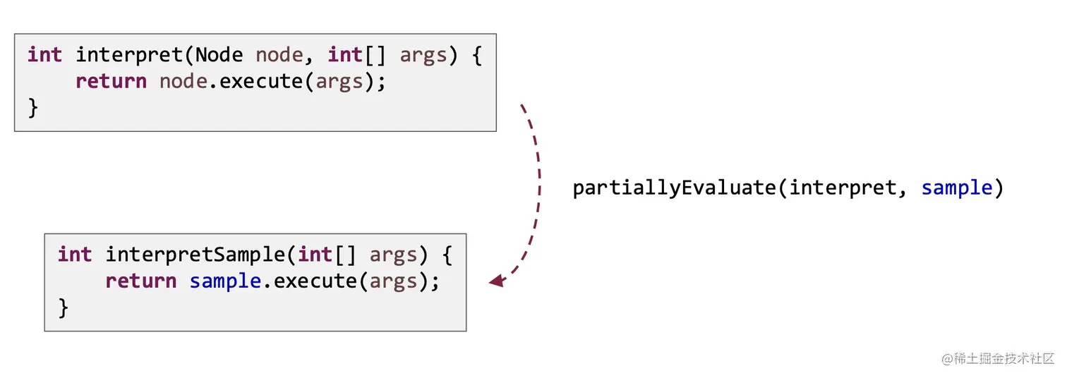 新程序prog_为prog的特化,他应该会比原程序更高效的执行,这个从prog转换到prog_的过程便称为Partial Evaluation。我们可以将Truffle预压的解释执行器当成prog,将某段由Truffle语言写的程序当做Istatic,并通过Partial Evaluation将prog转换到prog*。