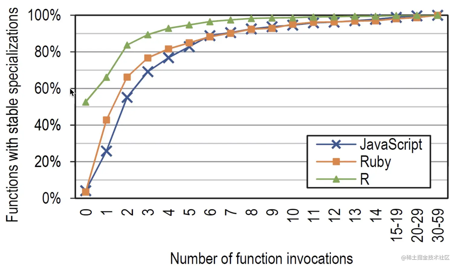 据统计,在 JavaScript 方法和 Ruby 方法中,80% 会在 5 次方法调用后稳定下来,90% 会在 7 次调用后稳定下来,99%会在 19 次方法调用之后稳定下来。