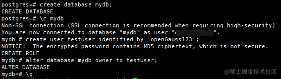 - 先在openGauss库中创建数据库,并在该数据库下创建用户,把mydb属主设为该用户。(import_all.sh中使用PostgreSQL特有的createuser和createdb创建用户和数据库)