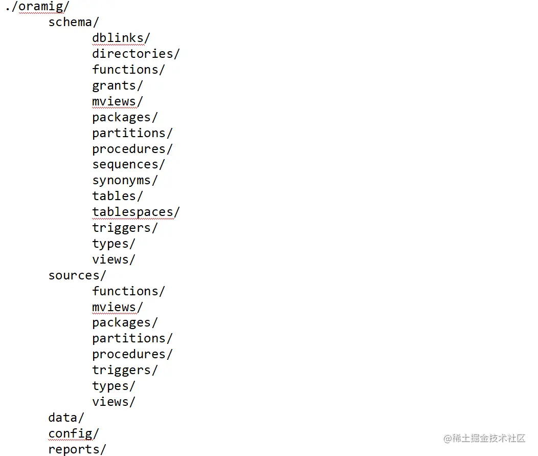 创建迁移项目后会在当前目录下生成oramig目录模板,如下所示。其中主要包含两个脚本export_schema.sh和import_all.sh,后续导出和导入即使用这两个脚本。schema和sources目录存放各对象的DDL语句,区别在于schema存放PL/SQL语法转化为PL/PGSQL后的语句, sources目录存放转化前PL/SQL的语句,data目录存放表数据文件,config目录包含配置文件ora2pg.conf,reports目录存放迁移报告。