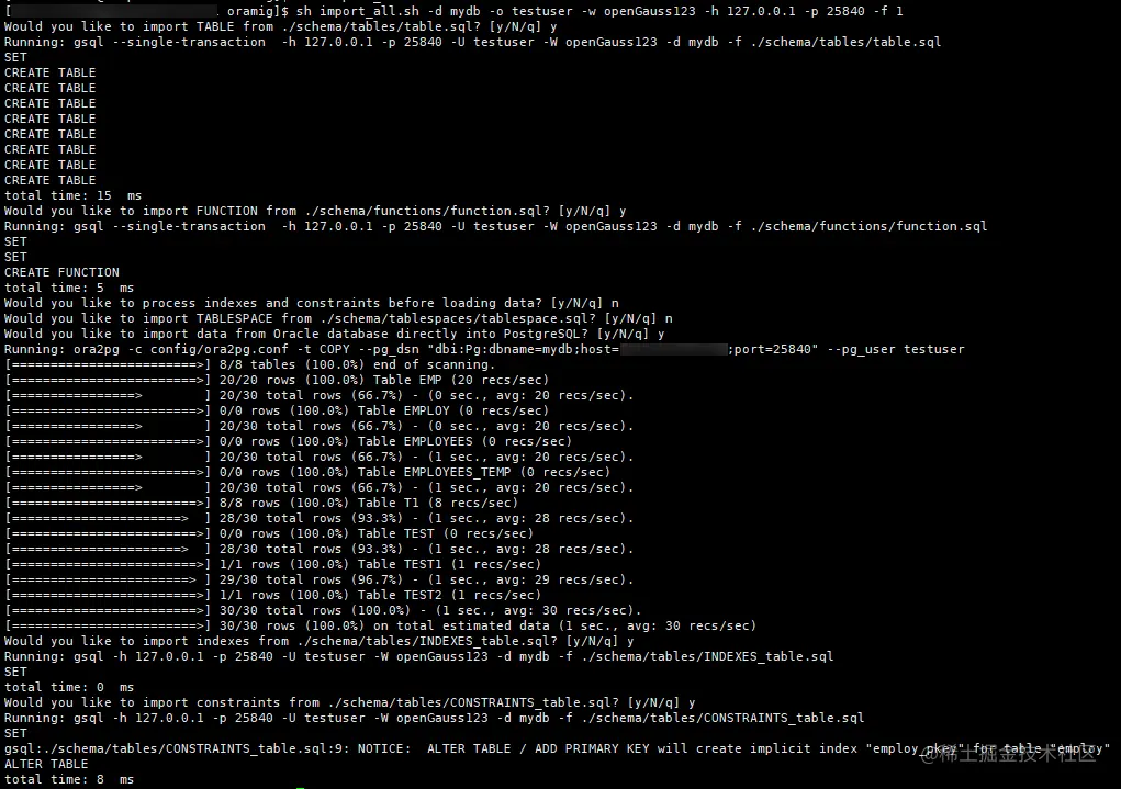 执行后会交互式提示是否导入各对象结构及数据,如下所示。(其中的-w是手动修改import_all.sh脚本,添加密码选项)