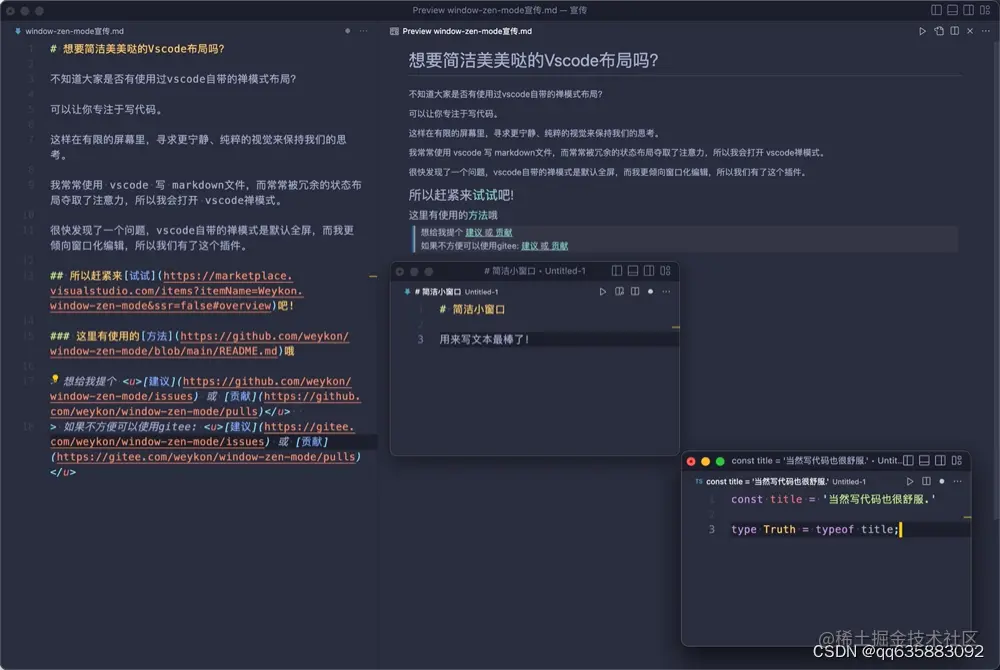 但是,vscode自带的禅模式是全屏 ,而我更倾向 窗口化 编辑,所以我们有了这个插件。