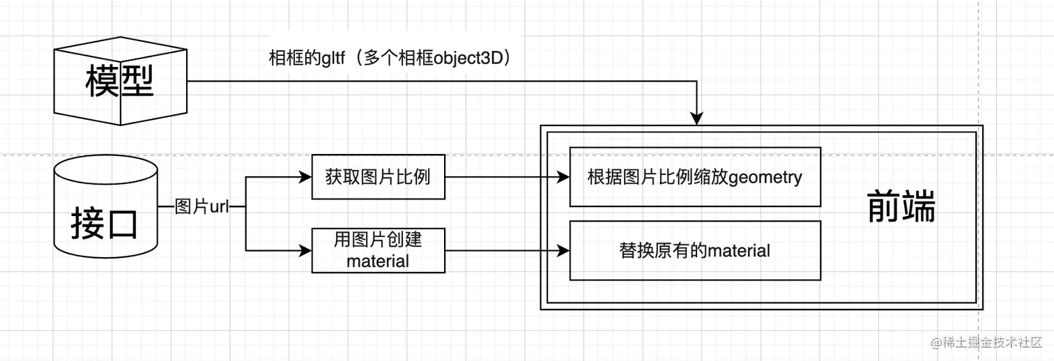 - 动态数据与模型融合:动态数据指用户上传的图片,画框是模型中的一部分。上传后两者要相互适应,图片数据融合进模型。